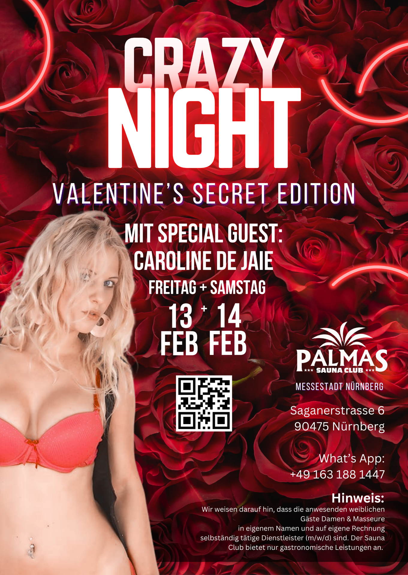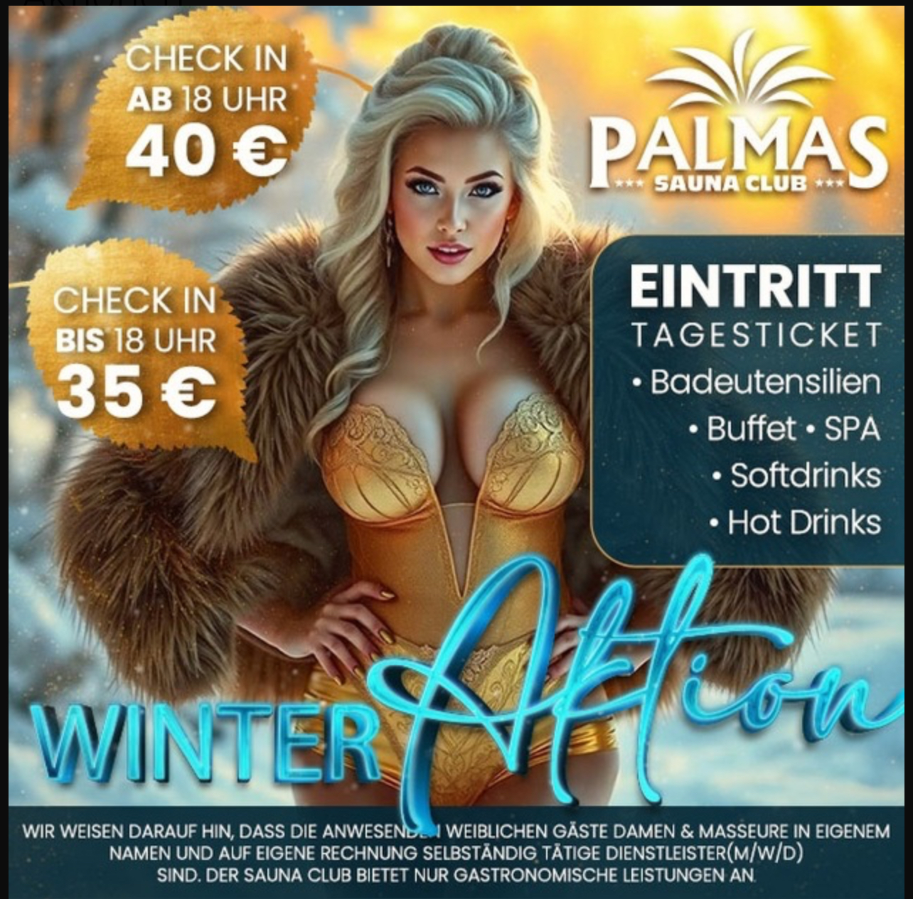 Der Sauna Club Palmas bietet nur gastronomische Leistungen an. Der Zutritt ist nur volljährigen Gästen gestattet. Wir weisen darauf hin, dass die anwesenden weiblichen Gäste (Damen & Masseure) in eignem Namen und auf eigene Rechnung selbständig tätige Dienstleister (m/w/d) sind. Sie sind keine Subunternehmer oder Angestellte des Sauna Club Palmas. Sämtliche angebotenen und kostenpflichtigen Dienstleistungen werden als Geschäftsbeziehung ausschließlich zwischen diesen Unternehmerinnen und den männlichen Gästen eingegangen. Der Sauna Club hat keinen Einfluss auf die Ausgestaltung und die Abwicklung.