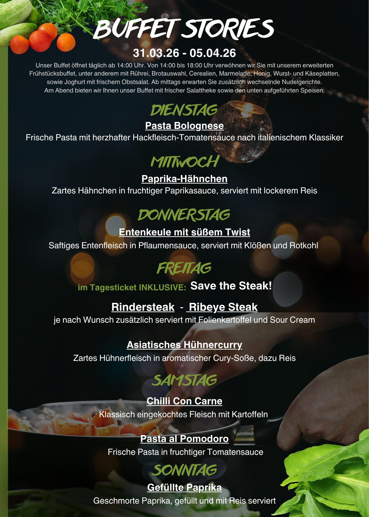 Von Dienstag bis Sonntag laden wir Dich ein, kulinarische Vielfalt zu entdecken. Jede Woche überraschen wir Dich mit neuen Kreationen, frischen Zutaten und saisonalen Highlights – für jeden Geschmack ist etwas dabei.